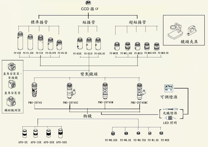 CCD相機接筒: 0745C0.5x, 0745C0.67x, 0745c1.0x (標準配置),0745c1.3x, 0745C2.0x