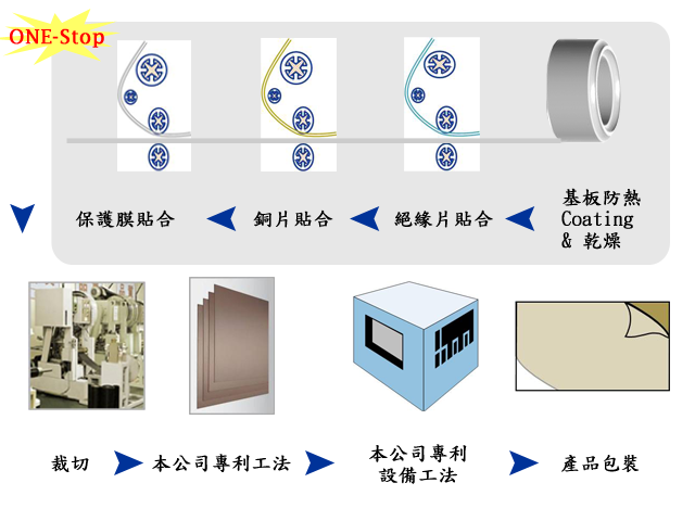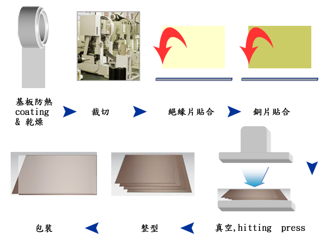 基板防熱 coating & 乾燥 ,裁切 ,絕緣片貼合 ,銅片貼合 ,包裝 ,整型 ,真空, hitting press ,保護膜貼合 ,產品包裝 ,本公司專利設備工法 ,本公司專利工法