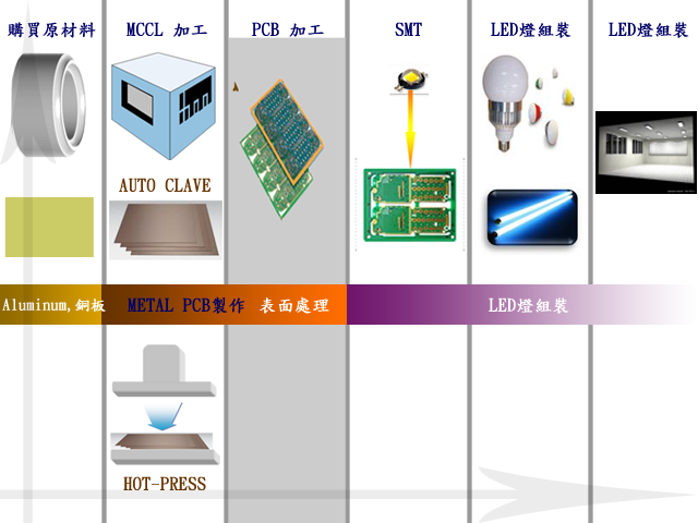 購買原材料,MCCL加工, AUTO CLAVE, PCB加工,SMT, LED燈組裝,Aluminum,銅板,METAL PCB製作,表面處理,LED燈組裝, HOT-PRESS