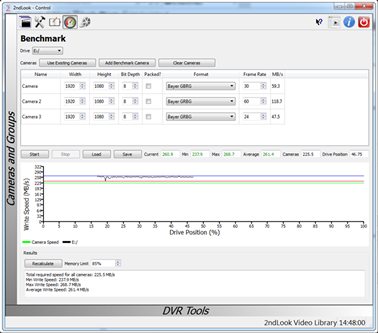 The new Benchmark tool enables the testing of a recording drive without needing a camera. This tool gives a user the confidence that the capacity and recording speed will be able to match the recording requirements. Only need a short recording? 2ndLook can buffer frames to memory and read them out when the recording is complete. The Benchmark tool will indicate if the recording drive won't be able to keep up with the speed of connected cameras and how long the system will be able to record directly to memory without dropping frames.