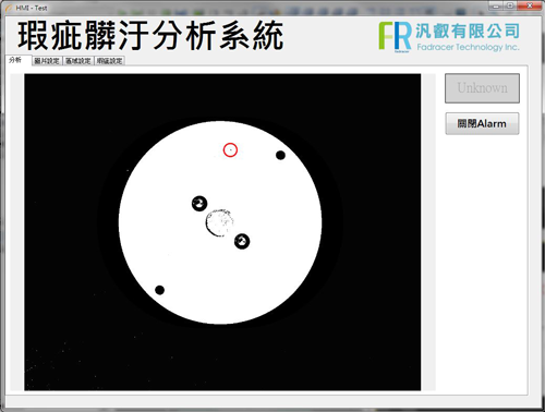 瑕疵髒汙分析系統可以分析樣本上的"瑕疵"與"髒汙",並在發現瑕疵時在畫面上顯示 Fail 讓使用者知道,另外可選購硬體Alarm的功能(塔燈/與機台Alarm連接)。