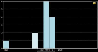 6. 利用 "RealArrayHistogram" filter,"inBinSize" 設 100. 如下圖示顯示出物件的面積分佈
