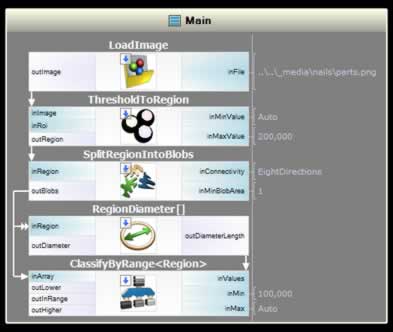 5. 利用 "ClassifyByRange" filter,"inMin" 設100.0, 將挑選出的釘子利用 "outInRange" 輸出