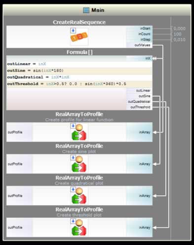 1. 利用 "CreateRealSequence" filter, "inCount" 設 1000, "inStep" 設 0.01,建立實數陣列,做函數的參數