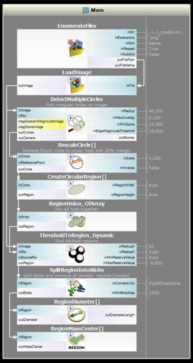 5. 發現圓圈,用於提取孔物件剩餘部份的內部 ROI , 要建立一個 ROI ,利用 "CreateCircularRegion" filter 轉換調整大小區域。每個圓圈將建立新的區域,為使處理速度更快,應加入所有的地區為一體。 利用 "RegionUnion_OfArray" 將它們連接起來