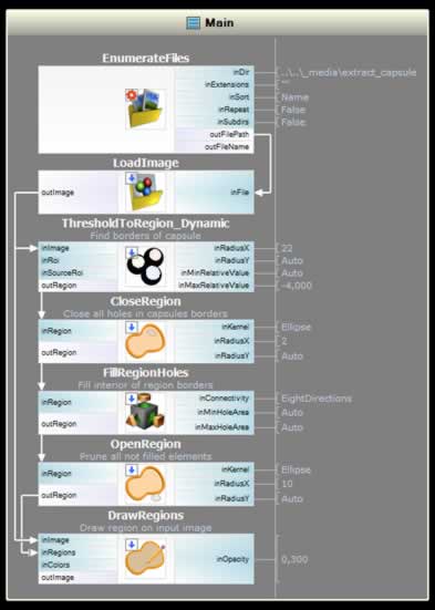 取得樣品(膠囊)的邊界,在第一步中,利用 "ThresholdToRegion_Dynamic" filter 得到樣品(膠囊)的邊框。第二步利用 "FillRegionHoles" filter 填補發現的邊界,"OpenRegion" filter 和 "CloseRegion" filter 對此也有所幫助,可以利用