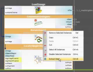 6.為了避免載入影像在每個迴圈中被之前的迴圈給載入,為了做到這點,所有檢測應移到新的 macrofilter 中。 "EnumerateIntegers" filter, "RotateImage" filter and "LocateSingleObject_NCC" filter 將其一起放入一個新的 macrofilter 中,取名為 DetectChip.