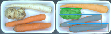歐洲常見的湯類蔬菜組合包是以隨機位置包裝在白色塑膠盤上。生產線作業員有時會忘記將某一種蔬菜放到盤子上。 雖然有秤重系統把關,但客戶在包裝密封前還是想知道商品是否完整。由於不會有兩種蔬菜看起來是完全相同的, 最理想的解決方案是採用深度學習為基礎的分類法。在訓練階段,客戶只須要在所選的蔬菜上做標註即可。