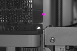 The position under the laser head changes for every single PCB and, as a result, the marking position is also different. Correcting it can be done in two ways: one, through mechanical fixing and second, through checking the position using a camera. In our design we have decided to combine both methods. The width of the PCB is mechanically fixed so thet the positioning in Y axis is always precise. Then the X axis deviation is checked by our camera application - we are checking the position deviation of the PCB edge in the X axis and then add this deviation as position offset to the laser head. Finally, the marking field's position is translated according to this measured value. Our device uses a 5MP mono camera and can achieve up to 0,05mm measuring accuracy, which is perfect for this kind of application.